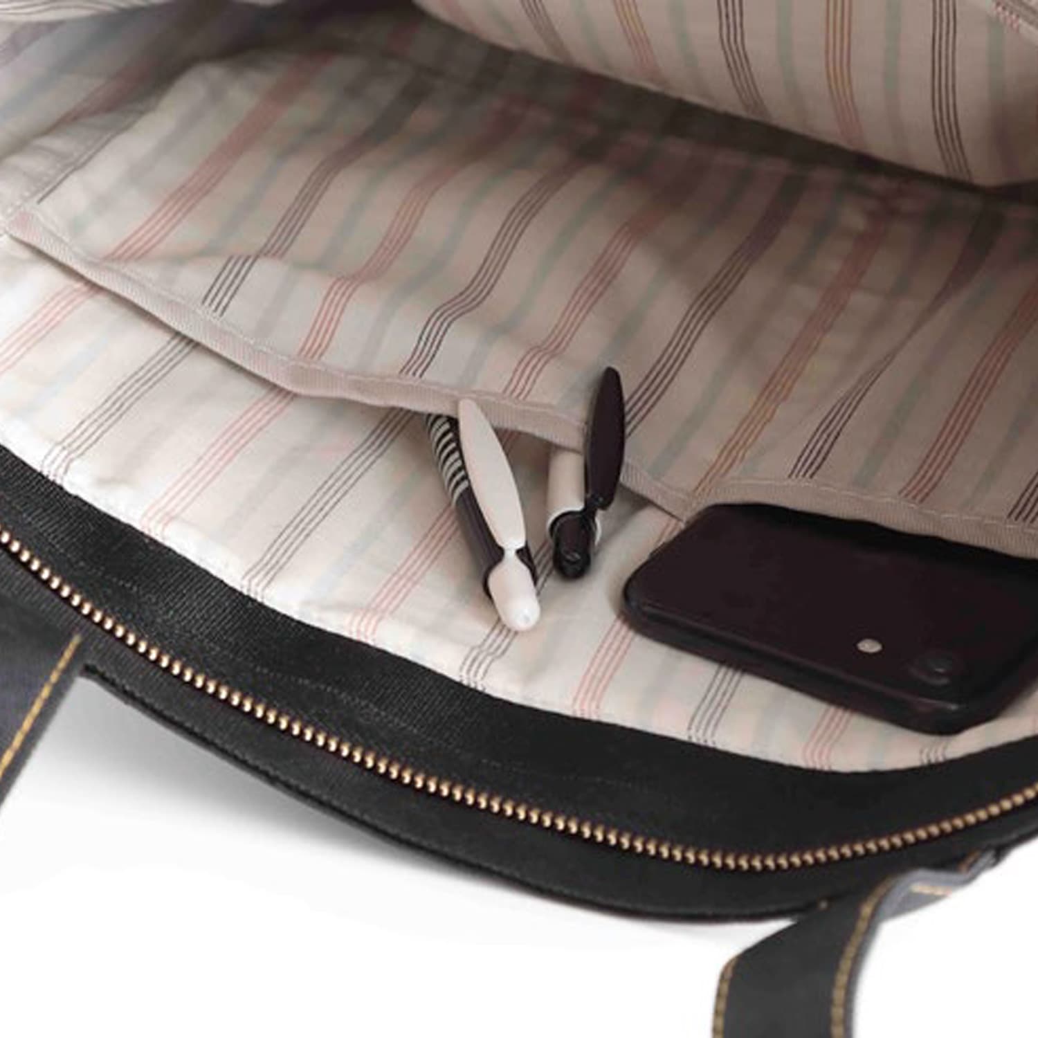 バッグの縫い目を内側にすることでソフトな印象に仕上げました。ライニングを施して、携帯電話やカードケースを収めるオープンポケットとファスナーがついたセイフティーポケットを両サイドに作りました。洒落たライナー生地はバッグを開けるのが楽しくなります。