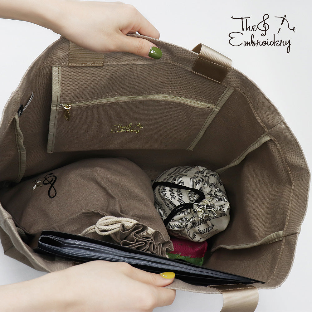 開閉部にはマグネットボタン、しっかりとした底板で美しいフォルムです。ファスナーポケット、オープンポケットを両サイドに付け、ワイドなハンドルは手で持ってもソフトで、肩に掛けても食い込むことなくお使いいただけます。毎日使いたくなる綺麗な刺しゅうを丁寧に施したMADE IN JAPANならではのバッグです♪