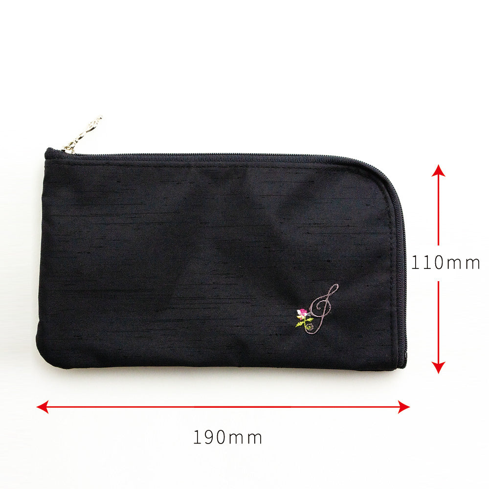 シンプルなボディに6種の音楽モチーフを刺繍したマルチポーチは、L字型に広くファスナーで出し入れのし易さは抜群です。