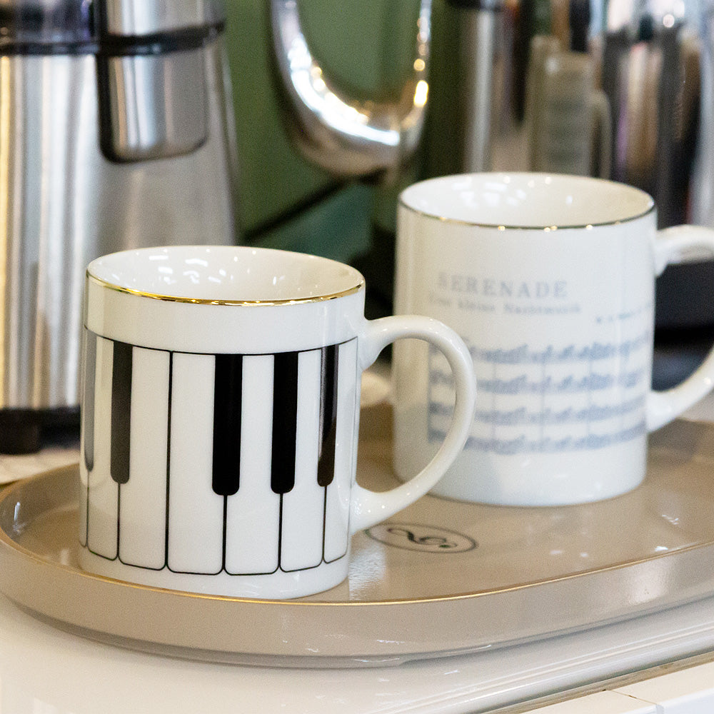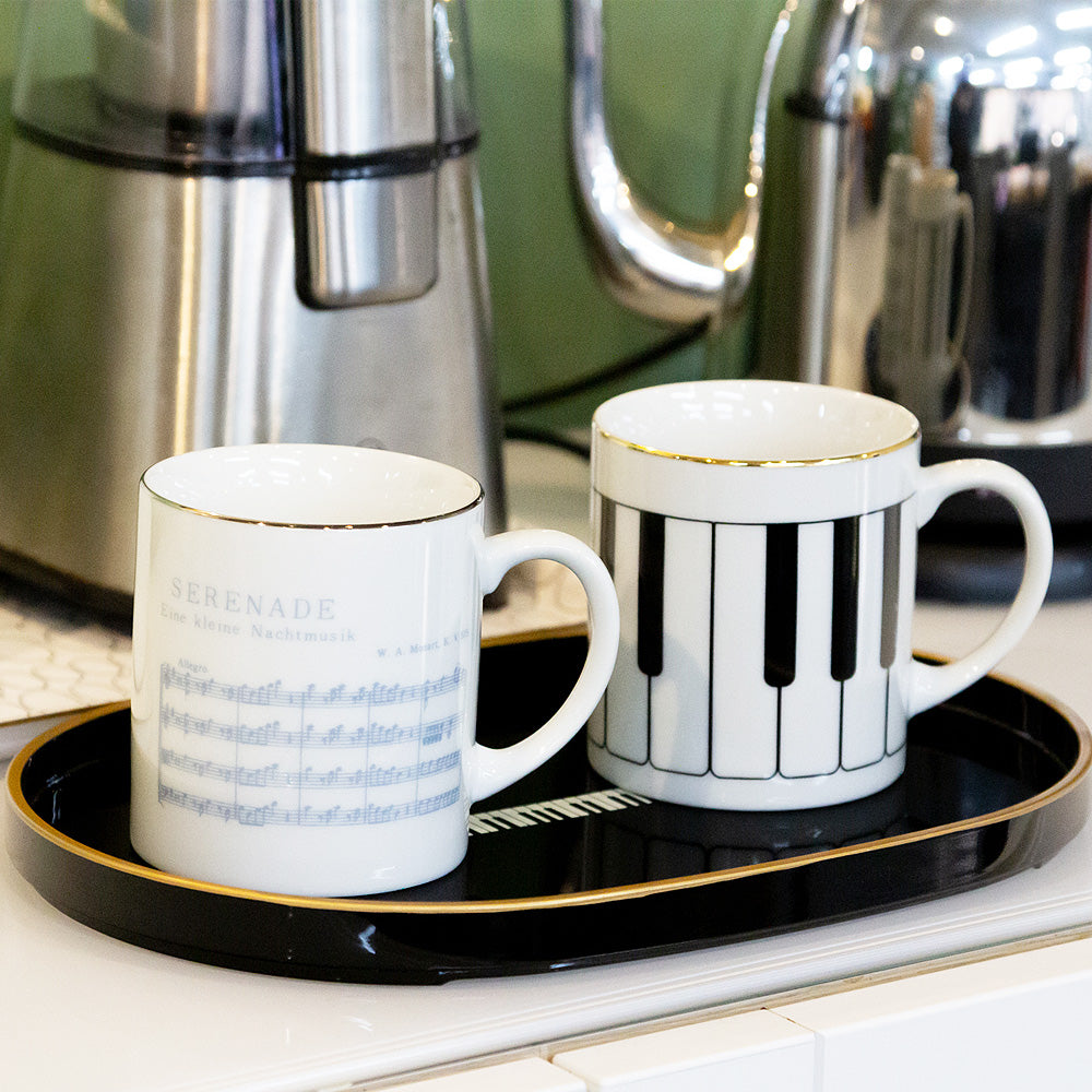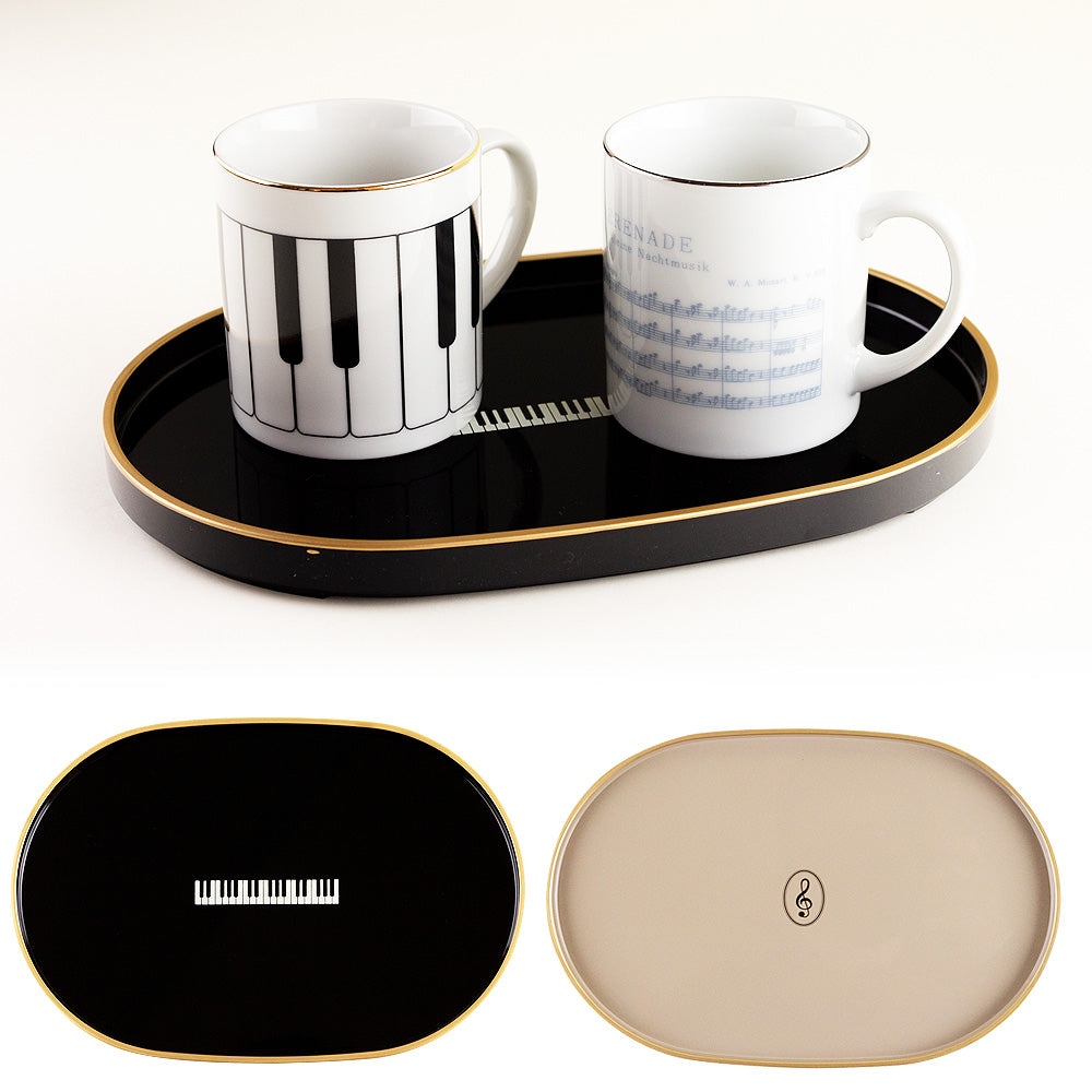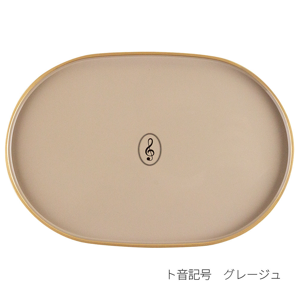 ゴールドで縁取り、ヨーロピアンイメージで仕上げられたティートレー。グレージュはト音記号、ブラックは鍵盤モチーフがデザインされています。